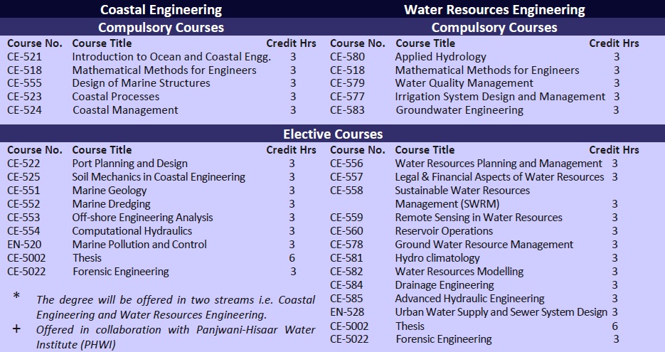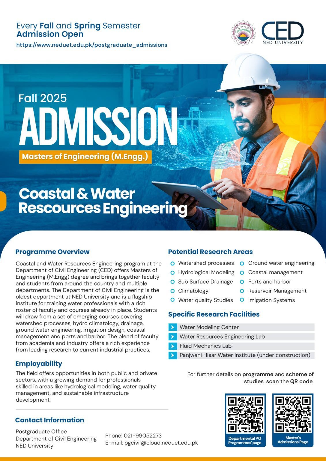 The Coastal and Water Resources Engineering Programme at the Department of Civil Engineering (CED) offers Masters of Engineering (M.Engg.) degree and brings together faculty and students from around the country and multiple departments. The Department of Civil Engineering at NED University is the oldest department and is a flagship institute for training water professionals with a rich roster of faculty and courses already in place. Students will draw from assets of existing courses covering engineering approaches, watershed processes, hydrology, climatology, drainage, water quality, hydraulics, groundwater engineering, coastal management, and port sand harbour. The faculty involved comes from the department itself, along with professional trainers and teachers from various relevant agencies in the water sector of the country. The blend of faculty from academia and industry makes a great combination for the students to learn from them about innovation and Current market practices.