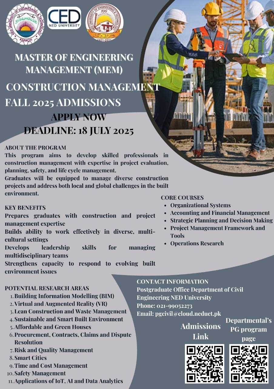 The Master of Construction Engineering Management program is designed for professionals who want to lead complex construction projects and advance into higher-level management roles. The program combines advanced engineering concepts with strategic planning, leadership, and data-driven decision-making. Students learn how to manage risk, control project costs, optimise productivity, and apply modern tools that shape today’s construction industry. The program prepares graduates to direct large teams, coordinate multidisciplinary work, and deliver projects that meet technical, financial, and environmental goals.